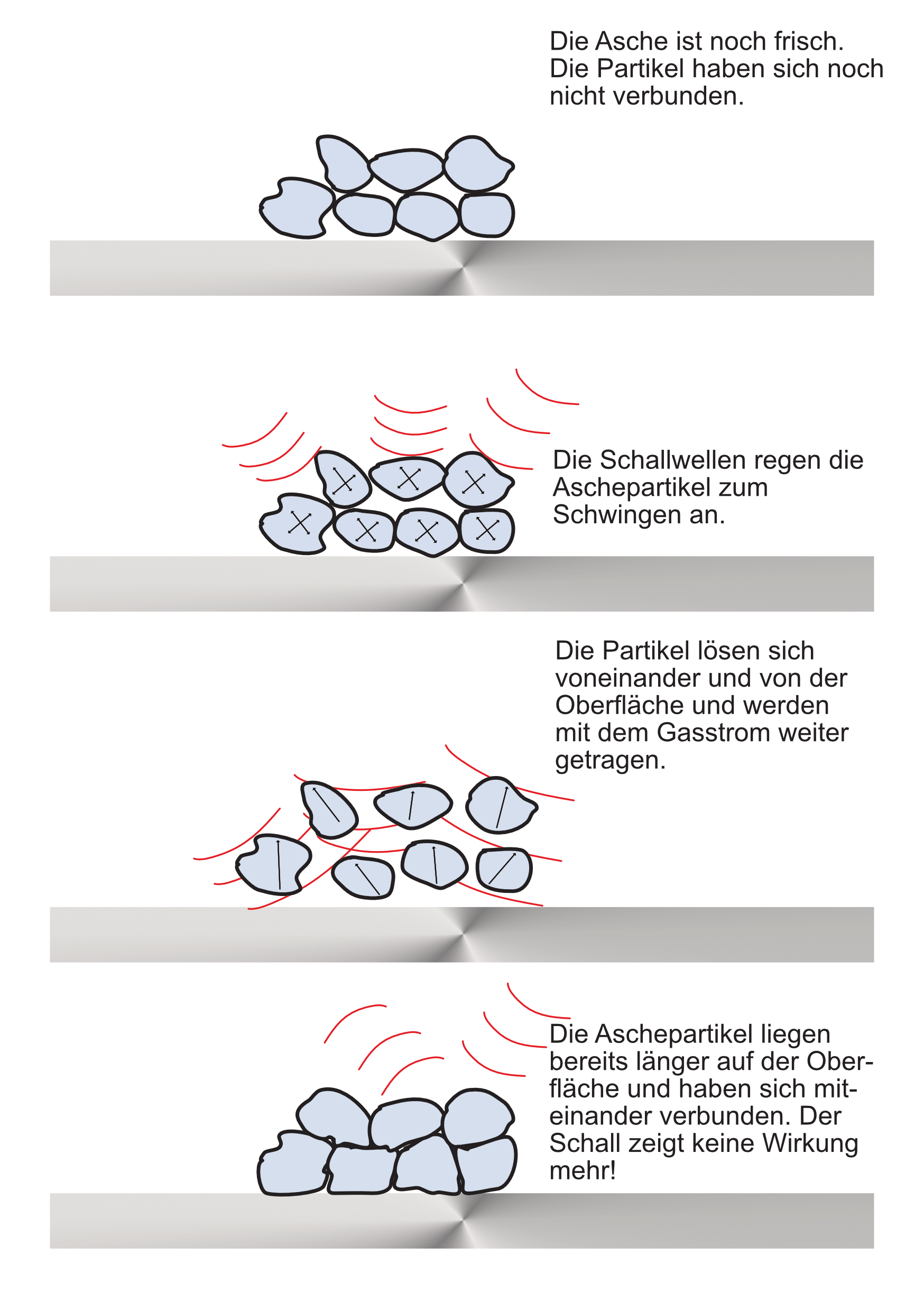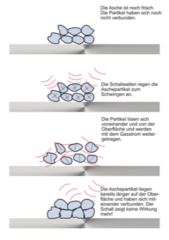 Le onde sonore del corno sonoro provocano una vibrazione o un movimento costante delle particelle. In linea di principio, qualsiasi tipo di polvere, cenere e farina - a seconda del contenuto di umidità dei componenti - può essere messo in moto fino a una certa granulometria con una pulizia accurata. In questo modo si evita che le particelle si depositino sulle superfici. A differenza di altri metodi di pulizia, una pulizia accurata mantiene pulite le superfici. Poiché il suono si propaga in forma sferica, le riflessioni possono raggiungere anche il retro di strutture complicate.